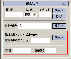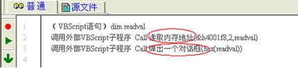 2、新增“讀取內存地址”功能 語法:VBSCall Call ReadMemory(內存地址:整數(16進制),類型:0-字節 1-整數 2-長整數,輸出值-所讀取的內容:長整型變量) 3、新增“按任意鍵繼續”功能 格式:WaitKey [變量名](注意這里是“變量名”不是“表達式”)