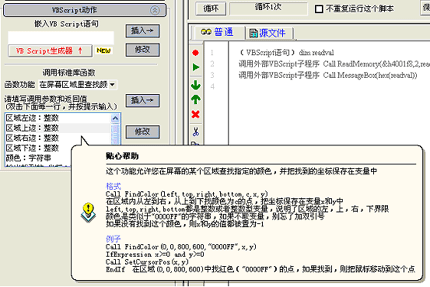 13、調用標準庫函數,不用再寫@<stdlib.bvs> 14、解決了抓點后鼠標會漂移的問題 15、加入了IfColor語句的模糊判斷,不過還不能調整模糊的精度 有些游戲的顏色會因為機器的不同而導致抓點的顏色不同,新版加入的顏色的模糊判斷,可以增強腳本的兼容性。 |