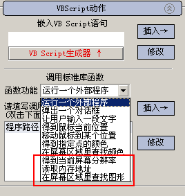 格式:VBSCall Call GetScreenResolution(輸出值-橫向屏幕分辨率:整型變量,輸出值-縱向屏幕分辨率:整型變量) 5、優化“顏色查找”功能,查找速度提高10倍! 查找顏色的速度大大加快,以前掃描全屏大概需要4秒左右,現在只要0.3秒,這意味著可以在腳本中大量的使用大面積的顏色查找而不必擔心速度問題。