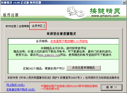 如圖在主界面點擊“會員”按鈕,即可進入會員區,正版注冊用戶可在會員區享受一系列會員服務,我們也再次感謝大家的注冊支持,會員服務包括:zui新版的優先下載、定期發放一些優秀腳本的源代碼、定期贈送一些游戲點卡或者QQ卡或者電影卡之類的東東。總之,常來會員區看看,沒錯的 :)